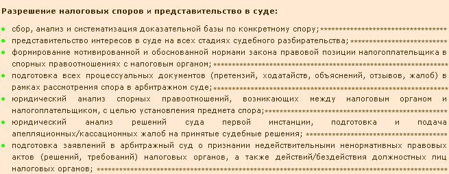 Наша компания занимается разрешением налоговых споров, т.е. споров, связанных с исчислением и уплатой налогов, в установленной законом форме между государством и иными участниками налоговых правоотношений . Проще говоря - это спор между гражданином или компанией с одной стороны и налоговым органом, с другой. Следует отметить, что в последнее время существенно увеличивается количество судебных споров между предприятиями и налоговыми органами. Несовершенство налогового законодательства РФ с его постоянными изменениями нередко дополняется непрофессионализмом и невнимательностью самих налоговых инспекторов. Как следствие возникновение дел в арбитражных судах по необоснованным формальным претензиям налогового органа к налогоплательщикам.